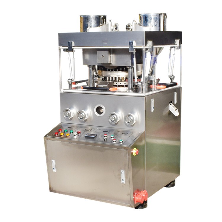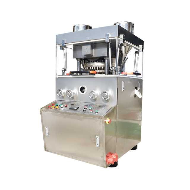 Bei dieser Maschine handelt es sich um eine automatisch rotierende und kontinuierlich arbeitende Tablettiermaschine mit Doppelpressung, die körnige Rohstoffe zu runden Tabletten, Buchstabentabletten und speziell geformten, zweifarbigen Tabletten verdichtet.Es wird hauptsächlich zur Tablettenproduktion in der Pharmaindustrie eingesetzt, eignet sich aber auch für Chemie-, Lebensmittel-, Elektronik- und andere Industrieunternehmen.